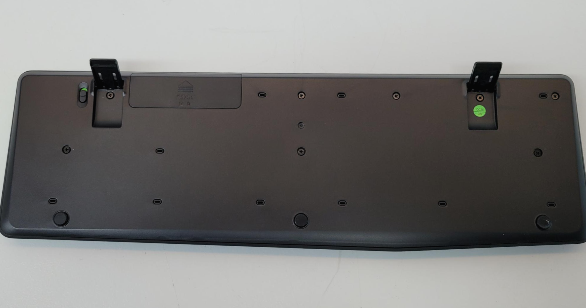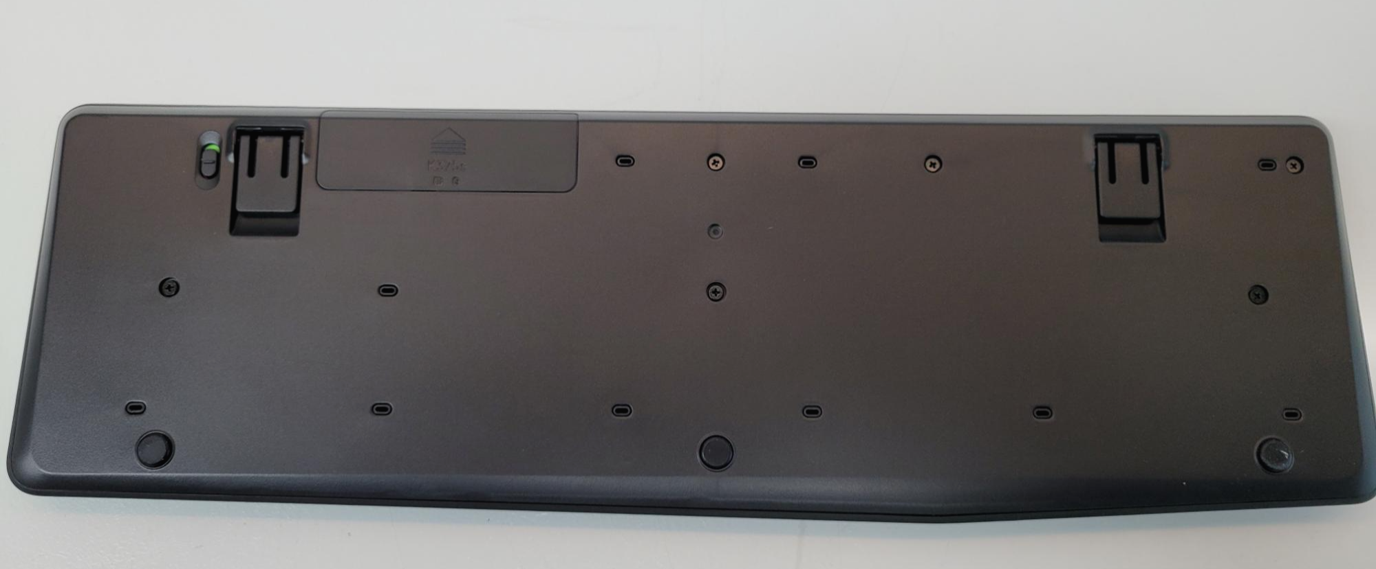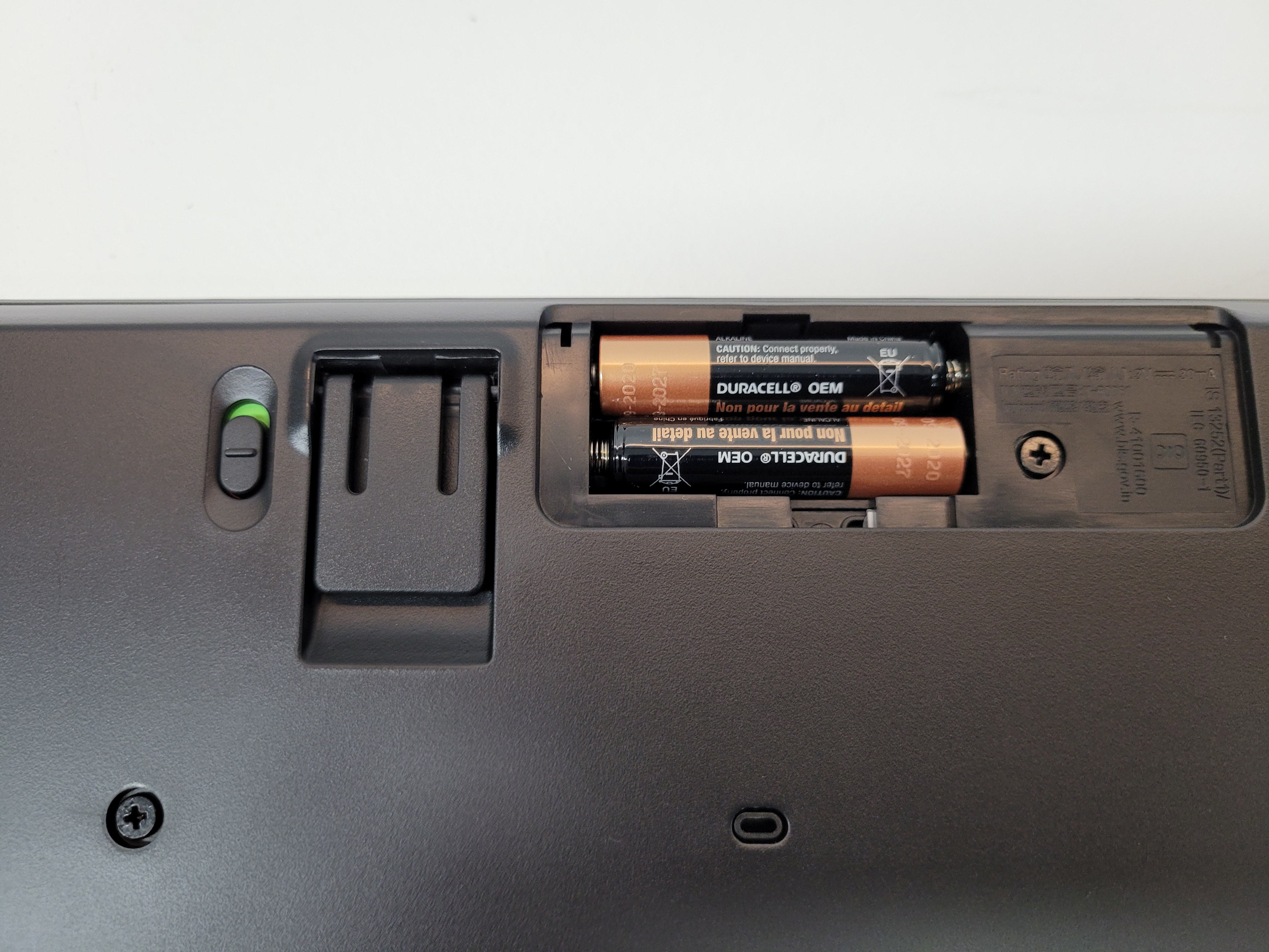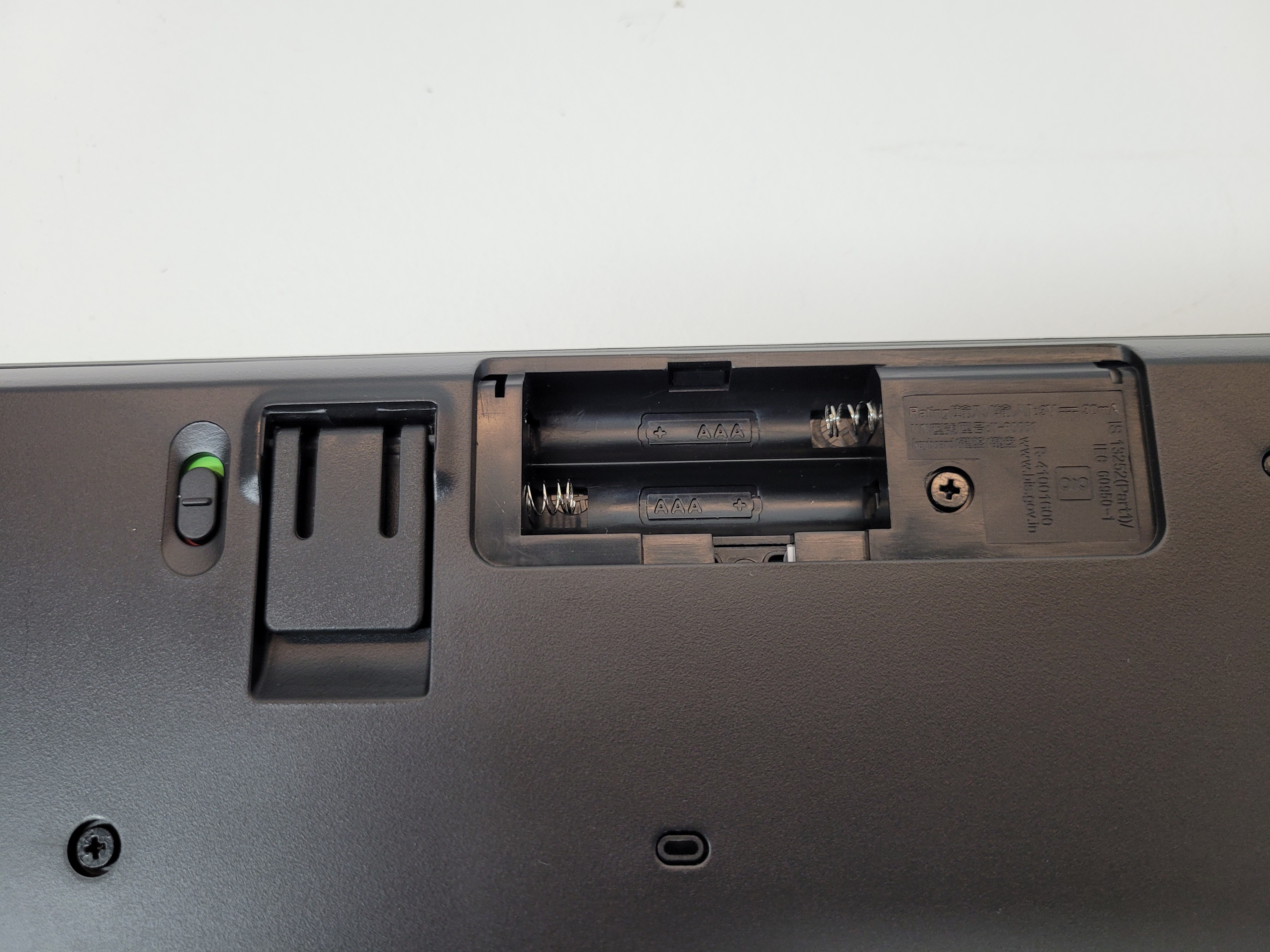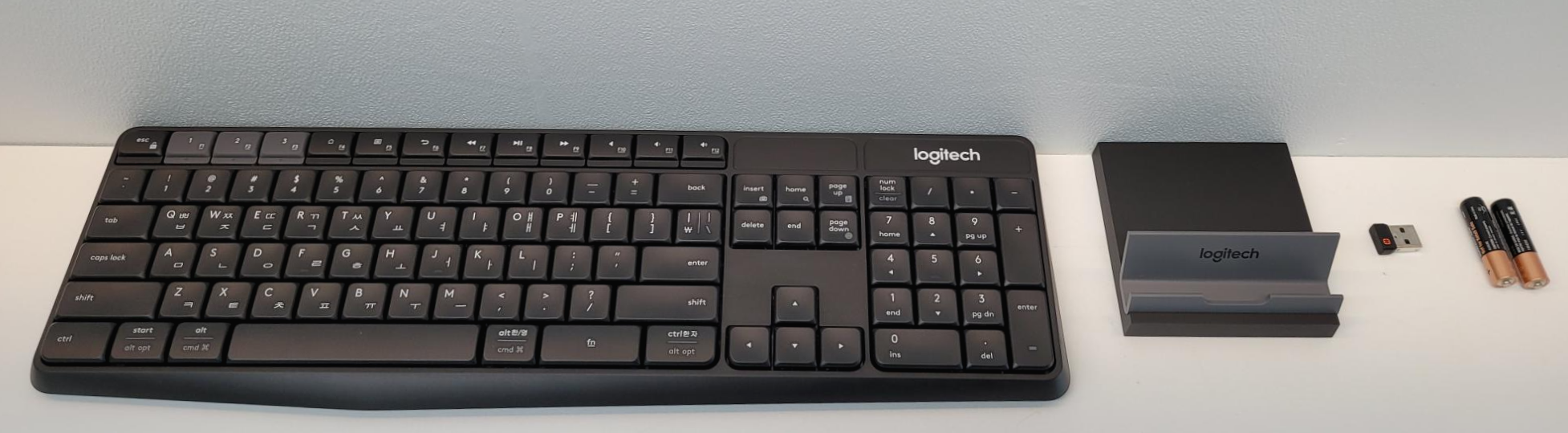 구성품으로는 키보드, 거치대, 수신기 그리고 AAA 배터리 2개가 들어 있습니다.